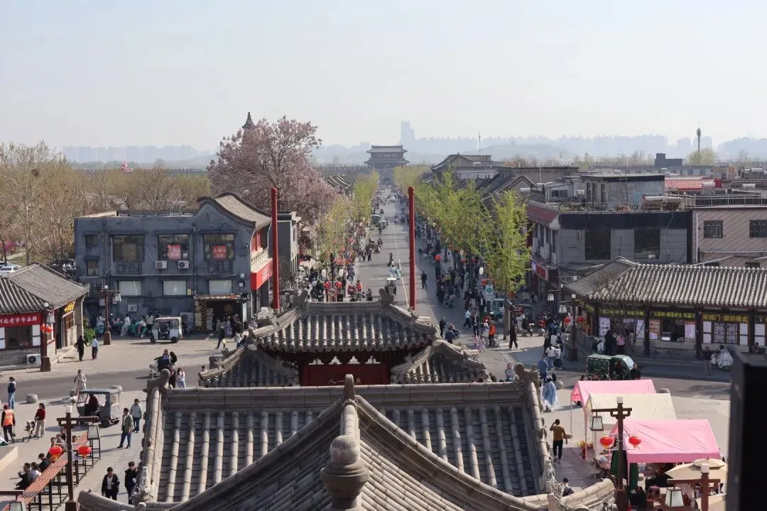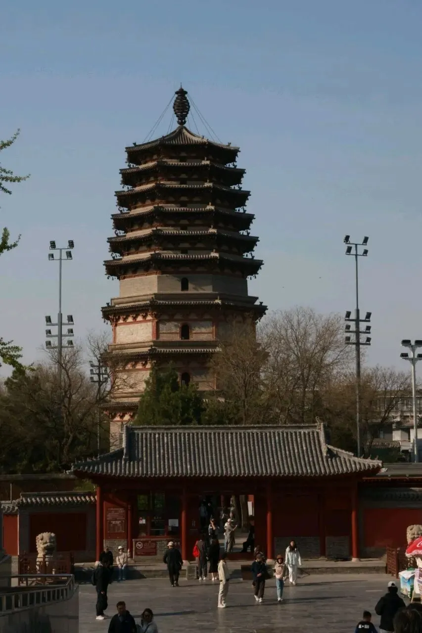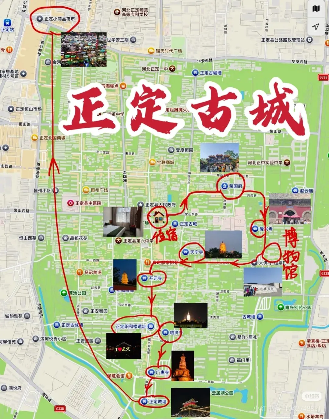 上午自驾抵达正定古城。古城内停车位大多免费,但清明假期人流、车流都很大,我们找了个稍偏的位置停车,之后改乘电车出行逛景点。下午两点左右安顿好,先去吃了正定饸饹和烧麦,烧麦有牛肉馅、羊肉馅,蘸上醋和辣椒,味道特别棒。饭后依次逛了广惠寺、临济寺、正定阳和楼遗址、开元寺、天宁寺和隆兴寺。晚上去了荣国府,夜景很美还有演出,之后又去正定夜市解决了晚餐。可以看这个来自小红书的图,基本上是按照倒序。如果有读者朋友也计划前往的话,建议按照图中顺序进行,因为荣国府和隆兴寺比较大,花费时间会更长,其他寺庙拍照打卡就行。