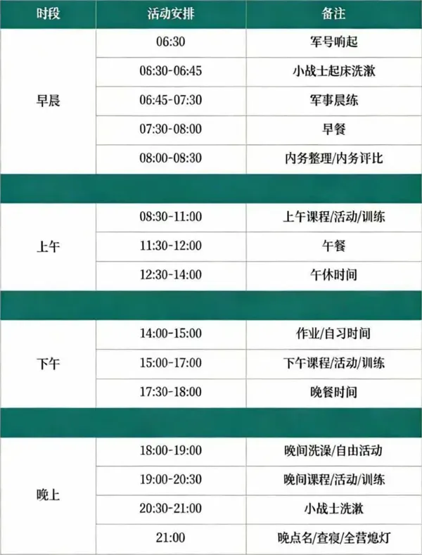 | 注;1、 内务和行为规范始终以军校模式进行高标准严要求,纳入日常作训生活和每一个课程。2、每日进行作业自主书写(携带作业及相关课外书籍)。3、 由于营期时间过长,具体课程执行情况根据天气情况和班级营员体质情况等外在因素进行相应调整。介意勿拍。 |