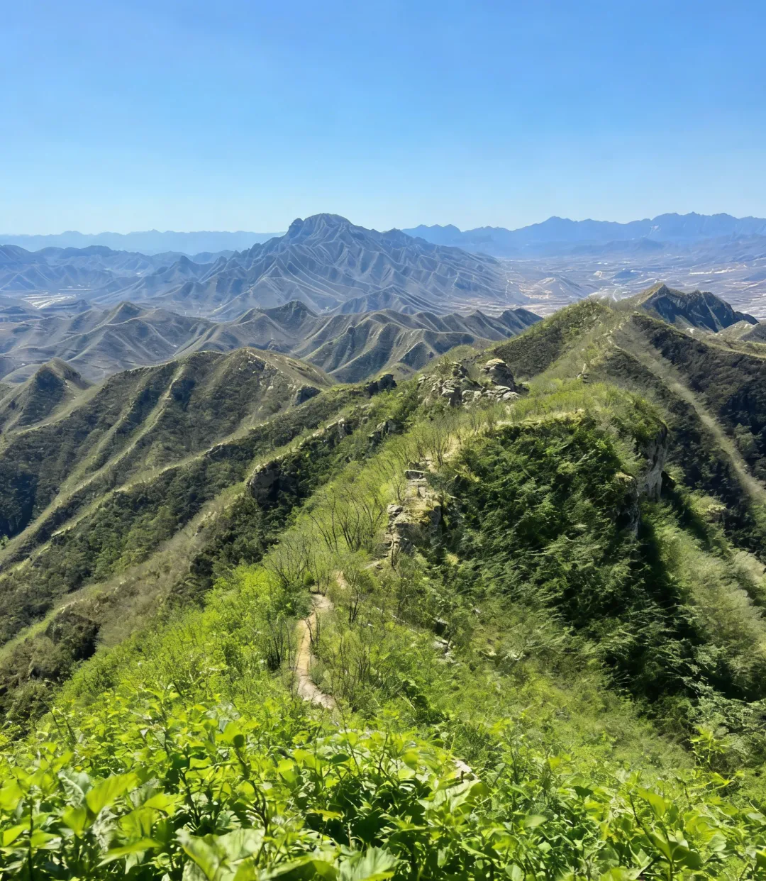 牛山寨紧邻三帽山,同样导航「井陉长峪村水库」即可抵达,是6座野山里难度偏低的一条,适合有少量徒步基础、想尝试野山的新手。整体爬升不高,路线清晰明显,环线全程约12公里,耗时约6小时,沿途风光原生态,草木葱郁,既能感受野山的乐趣,又不会过于疲惫。6.马头红-后峪村 · 5小时环线,寻轨迹前往