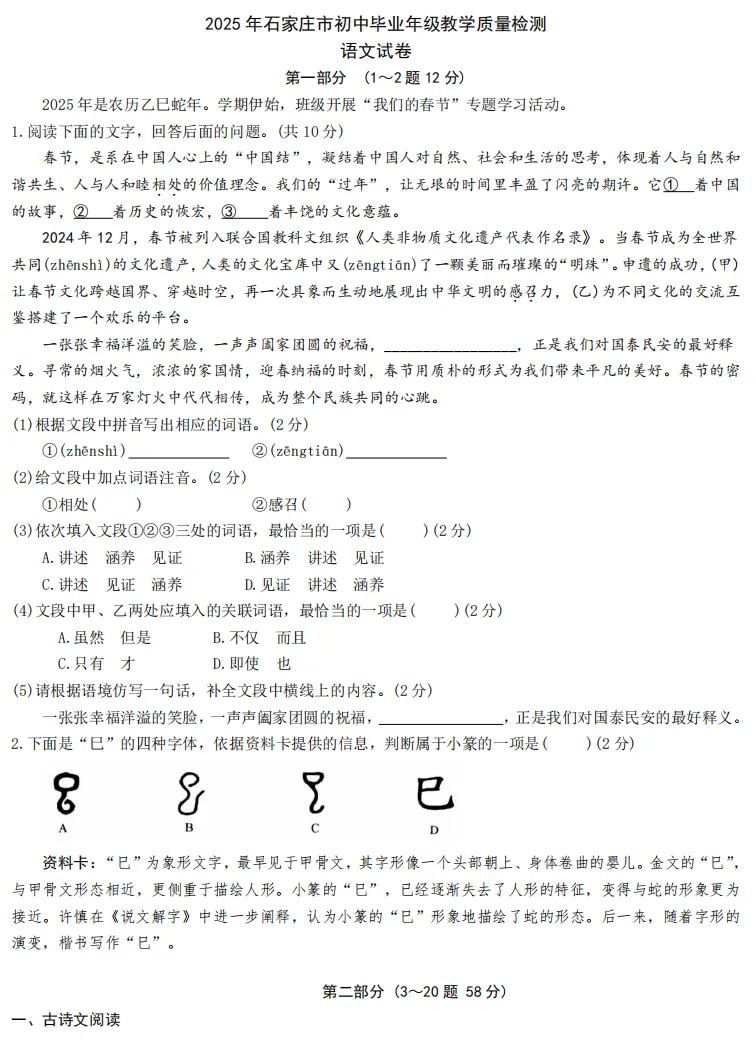 17.(3分)人们勤劳,就会早早地在春天刚到时就早行动,早发力;在新时代,人们因地制宜,发展产业,惜时努力,热爱生活,富裕幸福的生活也会早早到来。(答出一点给2分,答出两点给满分,意思对即可)