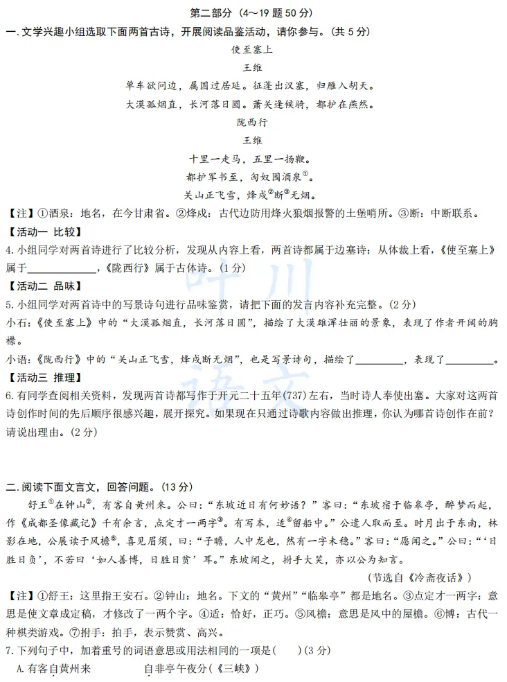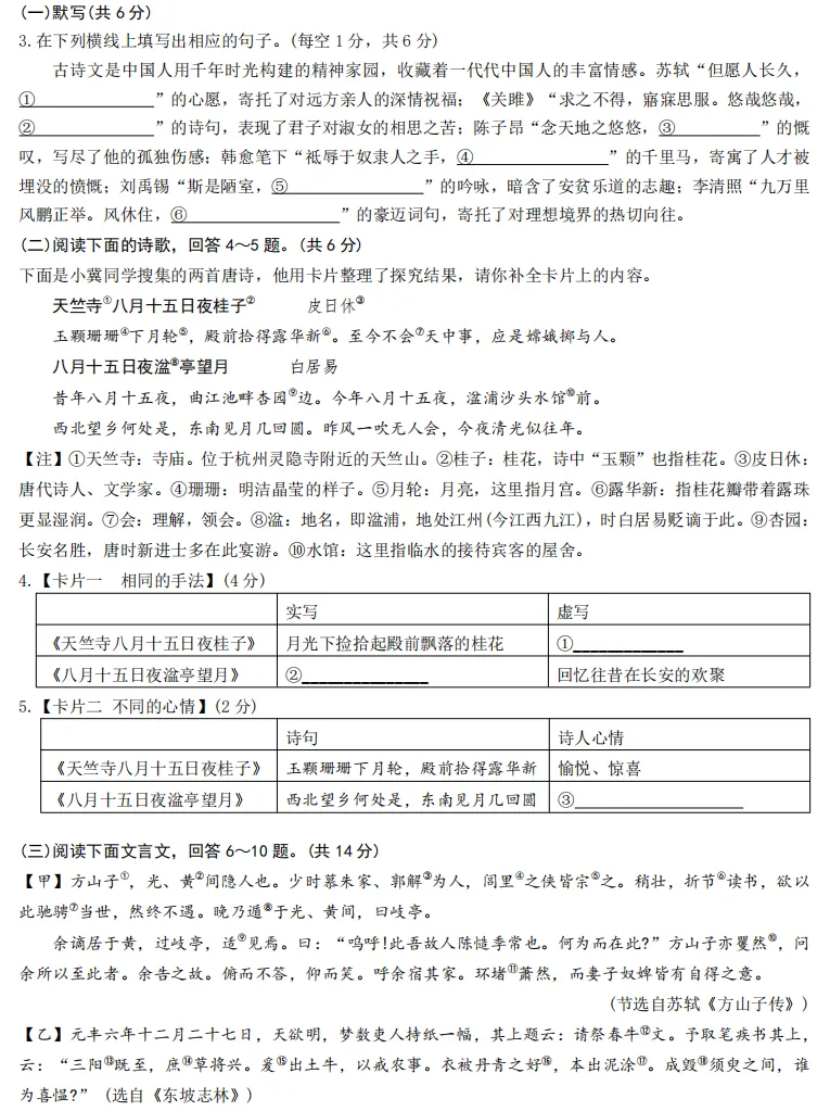 4.(4分)示例:①想象飘落的桂花是月中嫦娥抛给人间 ②今夜在湓浦沙头水馆前望月(每空2分,意思对即可)