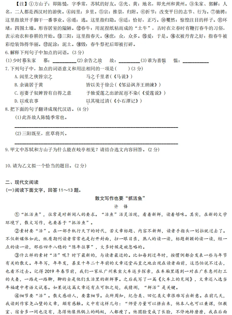 9.(2分)示例:方山子晚年在岐亭归隐,而苏轼贬谪于黄州,路过岐亭,恰好遇到方山子。(意思对即可)