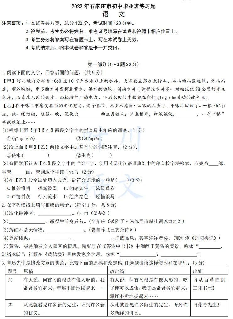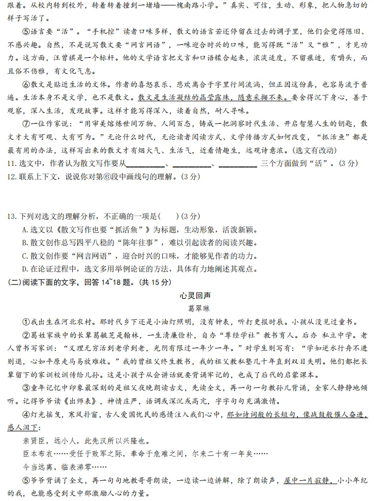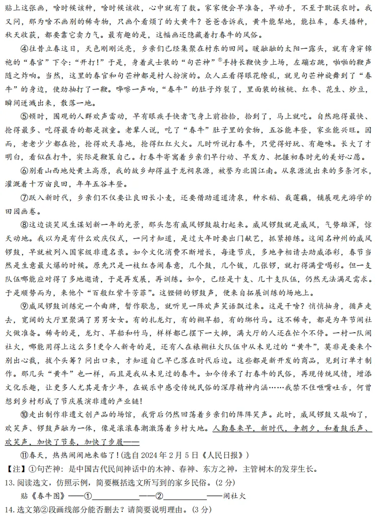 14.(3分)示例一:不能删掉。划线部分详细描写了《春牛图》的内容,表明《春牛图》不是普通的年画,表现了人们对春的期盼,为后文写“打春牛”的风俗做铺垫。(言之成理即可得3分)