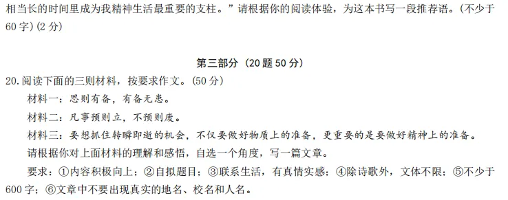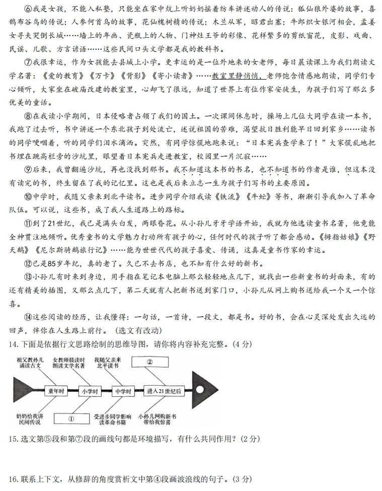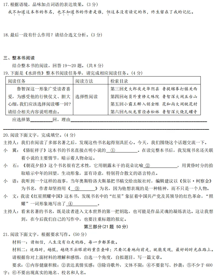 18.(3分)示例:起到收束全文、照应标题的作用;点明主旨,形象地写出了好的书籍对人的一生有深远的影响。 (意思对即可)