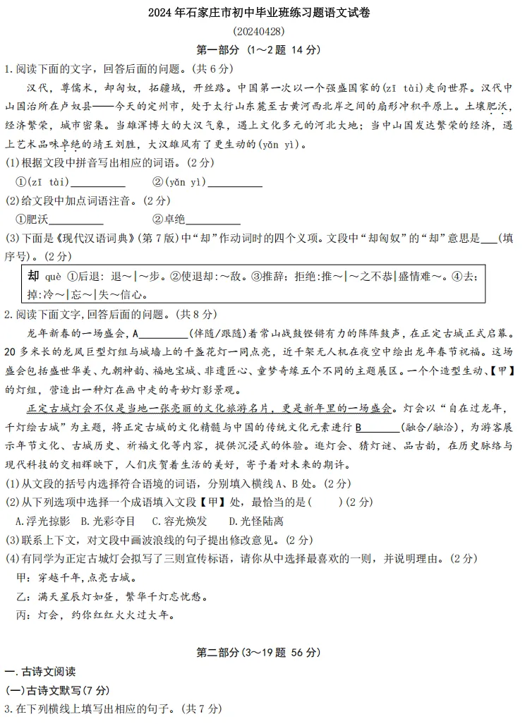 (4)(2分)示例一:甲;文字简洁,意蕴丰富,既写出了灯会的盛况,又写出了古城浓厚的历史文化底蕴。