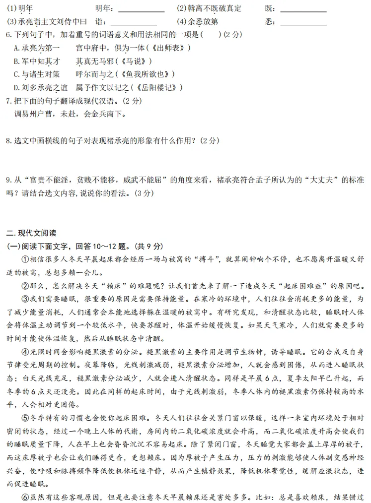 9.(3分)示例:我认为褚承亮符合孟子所说的“大丈夫”的标准。当金人要求其对策时,褚承亮不惧威逼胁迫,长揖而去;当他被举荐掌管藁城县时,他不慕名利,亦断然离去。这些行为都体现了他没有被富贵、贫贱、威武这些外部施加的因素所迷乱、动摇、屈服,坚守本心,所以,他符合孟子“大丈夫”的标准。