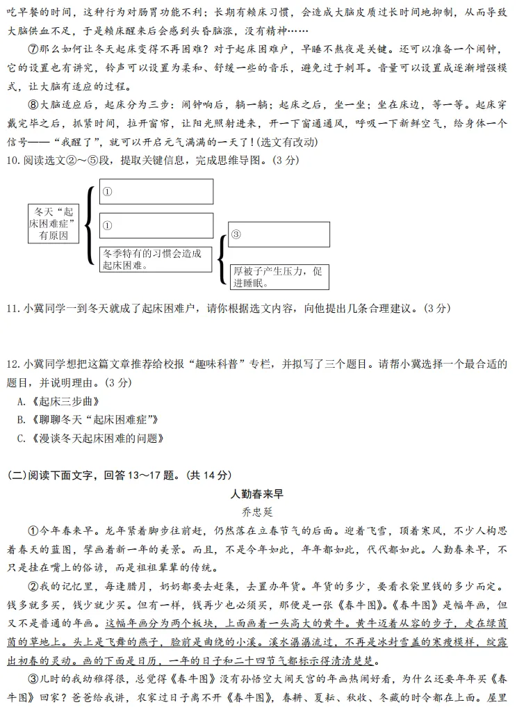 12.(3分)示例一:我选B。此标题语言亲切、自然,“聊聊”拉近了与读者的距离,“起床困难症”形象地写出了本文对起床困难问题的说明,引起读者的阅读兴趣,符合“趣味科普”专栏刊文科学且通俗有趣的特点。