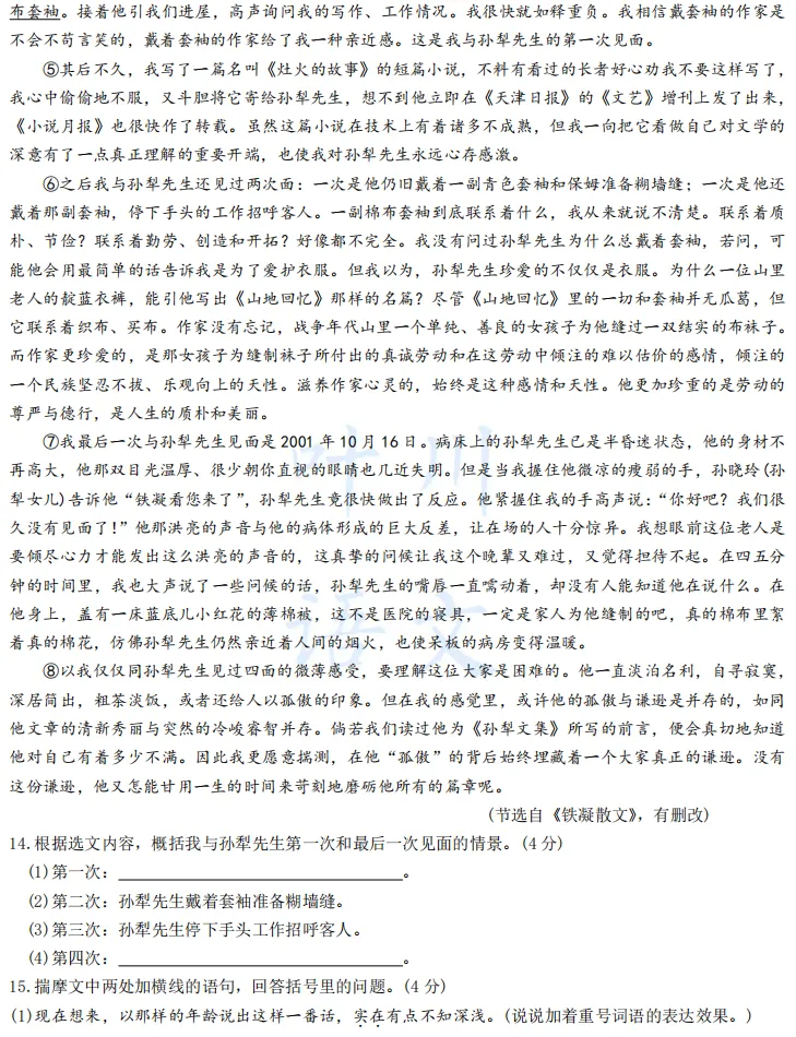 14.(4分)(1)孙犁先生在院子里捡豆子,亲切和我交谈。(4)孙犁先生在病床上还热情地招呼我。(每空2分,意思对即可)