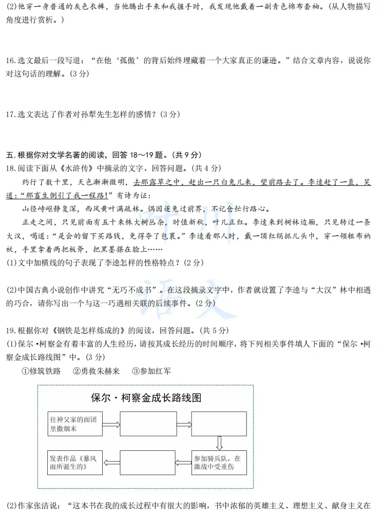 20.(4分)①示例:主人公②示例:难忘的往事③钢铁是怎样炼成的④示例:中国共产党及其领导的红色革命终将驱散黑暗,把光明与希望播撒到全中国。