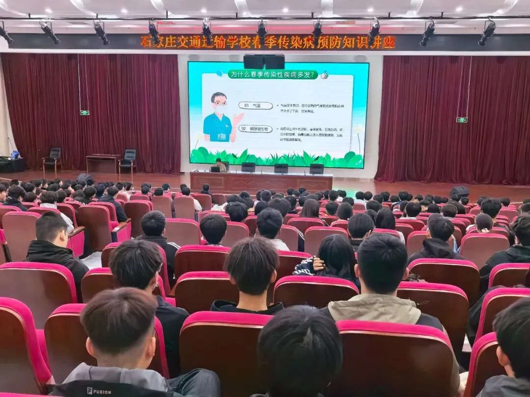 为切实保障全体学生身体健康,有效防范春季传染病在校园传播,4月9日下午,石家庄交通运输学校在第一报告厅开展春季传染病预防知识专题讲座,讲座由校医刘文主讲,四百余名学生有序参与,认真聆听学习。讲座中,刘校医结合春季气温多变、病菌易滋生的特点,用通俗易懂的语言,重点讲解了流行性感冒、肺结核、诺如病毒感染性腹泻、水痘等常见春季传染病的传播途径、临床表现及识别方法。针对学生集体生活的特殊性,校医着重强调了预防核心要点,提醒同学们养成勤洗手、勤通风、勤换衣物的良好卫生习惯,保持个人及宿舍环境卫生;均衡饮食、规律作息、加强体育锻炼,增强自身免疫力;尽量避免前往人群密集场所,出现不适及时就医并报告老师。讲座中,刘校医用真实案例为同学们敲响健康警钟,让预防知识深入人心。同时鼓励同学们将把所学知识运用到日常生活中,做好自我防护,共同守护校园健康环境。