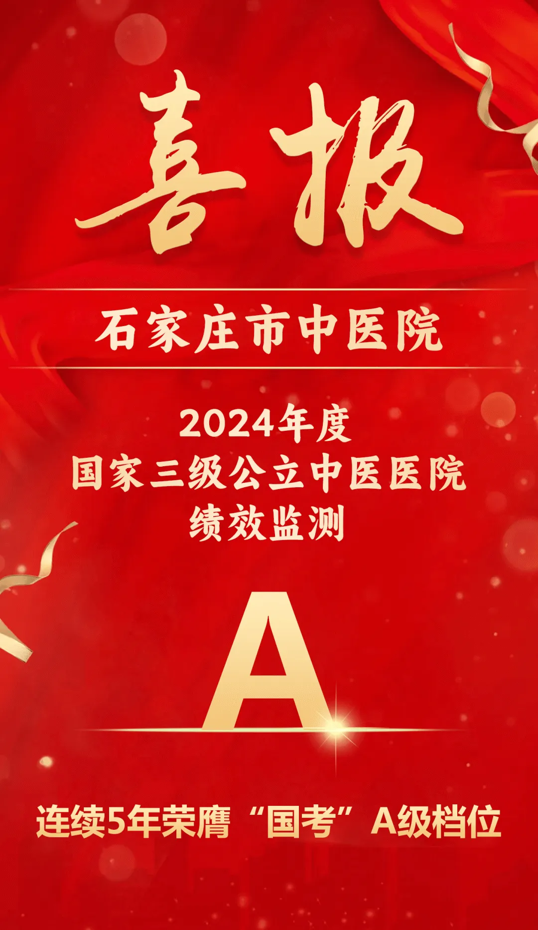 近日,国家中医药管理局发布最新年度全国三级公立中医医院绩效考核结果,石家庄市中医院以扎实的医疗质量、鲜明的中医药特色、高效的运营管理和优质的服务水平,连续五年荣获绩效考核A级档位,稳居全国中医医院第一方阵!