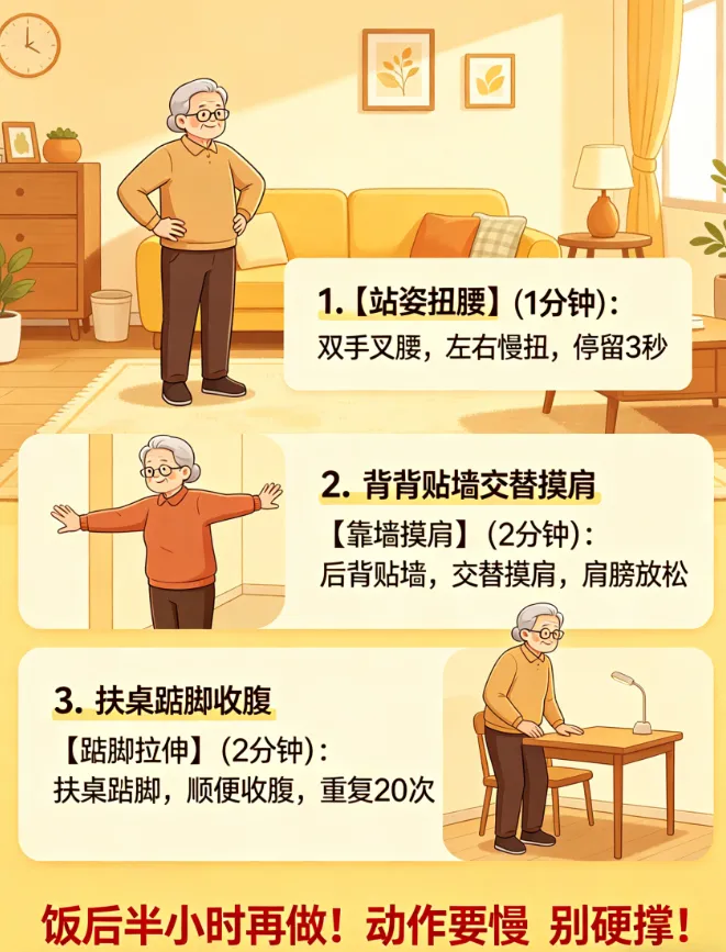 其实饭后不用出门散步,在家花5分钟做这3个拉伸操,就能促进消化、缓解腰酸,石家庄好多大爷大妈都在做,简单又管用!