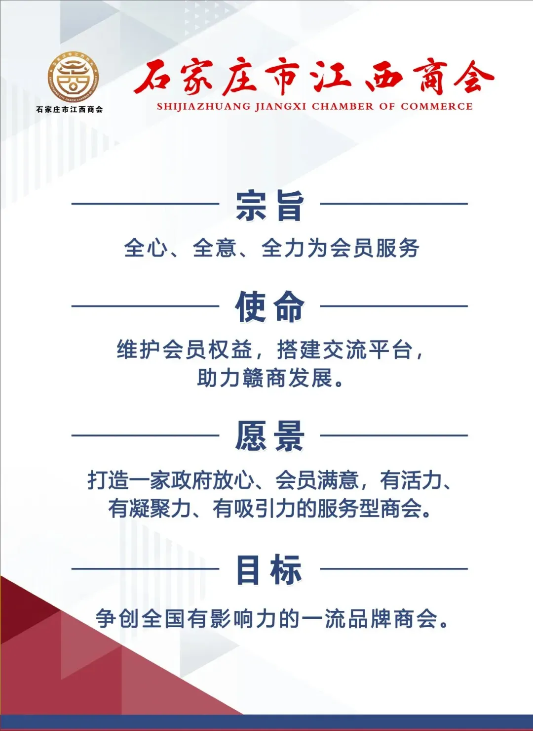 石家庄市江西商会是由在石家庄市从事生产经营活动的江西籍非公有制企业及非公有制经济人士自愿联合组成的非营利性社会组织,是在石赣商共同的“家园”。成立以来,石家庄市江西商会始终秉持“全心、全意、全力为会员服务”的宗旨,以“争创全国有影响力的一流品牌商会”为目标,践行优质办会理念,做好赣冀两地经济文化交流的桥梁。