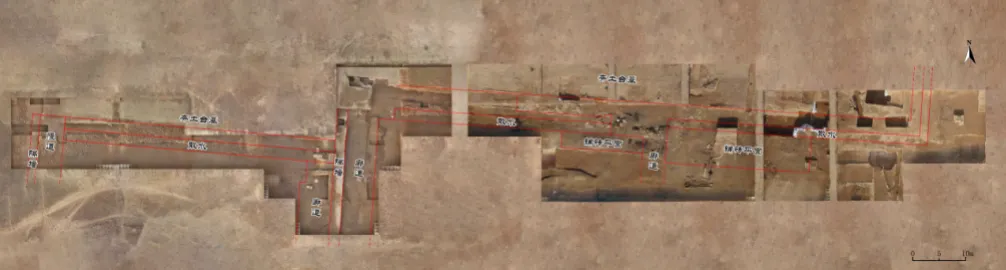 以已知的散水和台基边缘为线索,继续向西清理宫殿建筑的前部结构,通过2025年度的工作,明确了第二期宫殿建筑由不同的建筑单元组成。
