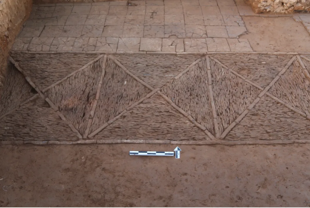 首先发现了上一年度所揭露的建筑单元的西部边缘,其西端存在一道南北向夯土隔墙,宽1.2米、残高0.3~0.4米。沿隔墙东侧有素面方砖铺砌的地面,其北端有慢道与台基相连,慢道之上铺砌菱形纹方砖。该建筑单元新揭露区域的散水结构及其与第一期散水的叠压关系与上一年度揭露部分保持一致,针对台基的清理发现台基外立面的墙皮可以分为多层,内层墙皮之上存在网状刻划痕迹,在涂抹新墙皮时起到了加强黏合效果的作用。