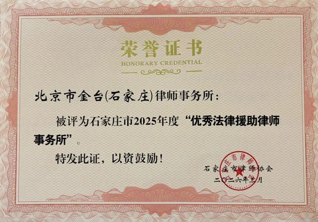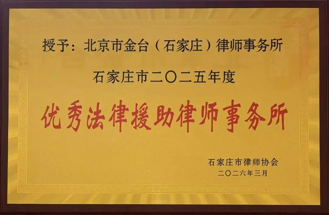 北京市金台(石家庄)律师事务所获得石家庄市2025年度“优秀法律援助律师事务所”。