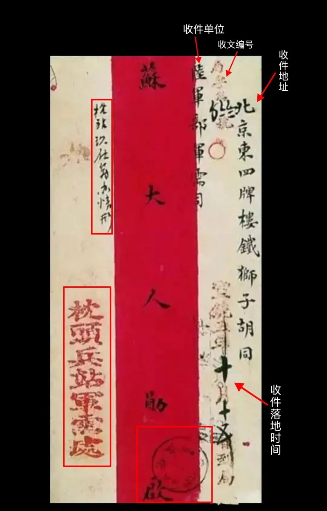 收件地址: “北京东四牌楼铁狮子胡同”,即清末陆军部衙署(今北京市张自忠路3号),是清廷最高军事中枢,1906年兵部改制为陆军部后,军需司就设在此处。1949年后为中国人民大学初创校址,今为人大清史研究所;