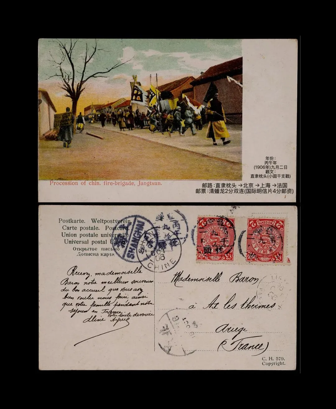 为“直隶枕头”干支小圆戳,与1906年枕头寄法国明信片的邮戳形制完全一致,是石家庄地名起源的一级实物证据。