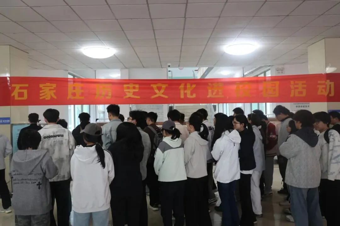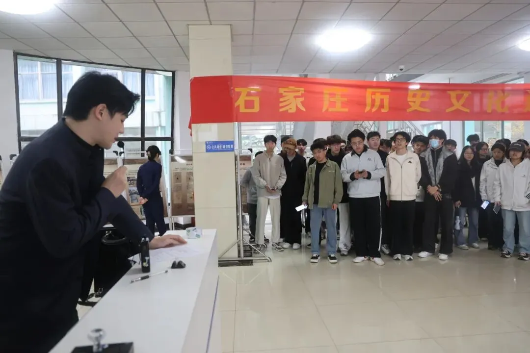 活动现场,博物馆讲解老师以讲解与观展同步进行的形式,带领同学们步入流动展区。大家围绕珍贵文物图片与详实史料展板,一边聆听生动讲解,一边系统梳理石家庄从古至今的发展脉络、历史变迁、文化传承与人文精神。讲解老师娓娓道来,同学们认真聆听、积极提问,在沉浸式体验中真切领略这座城市的厚重人文积淀。