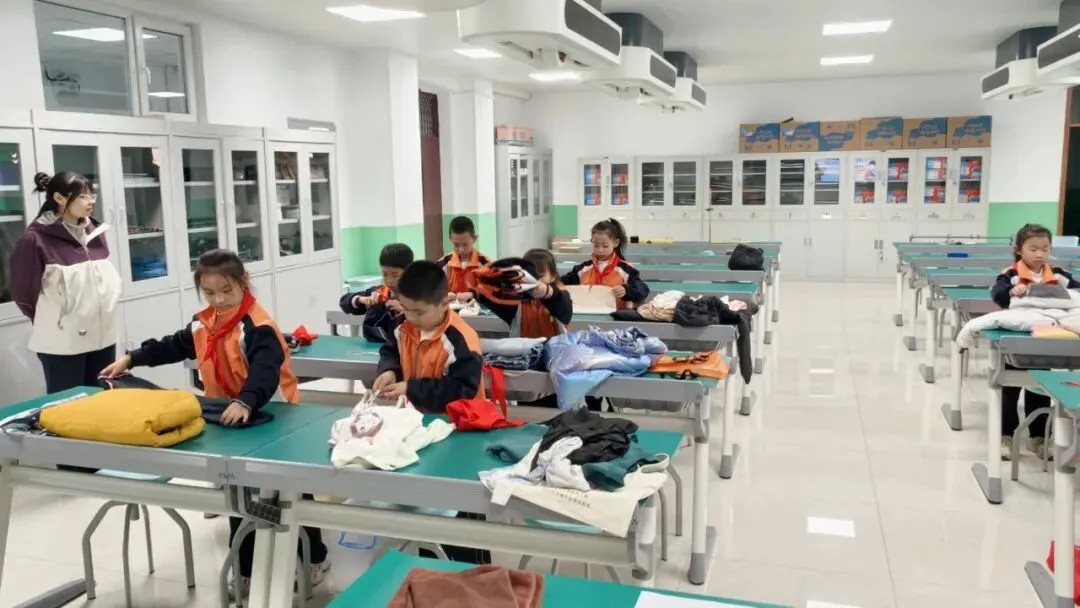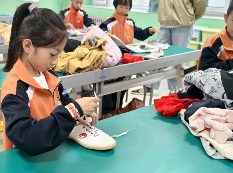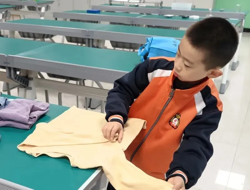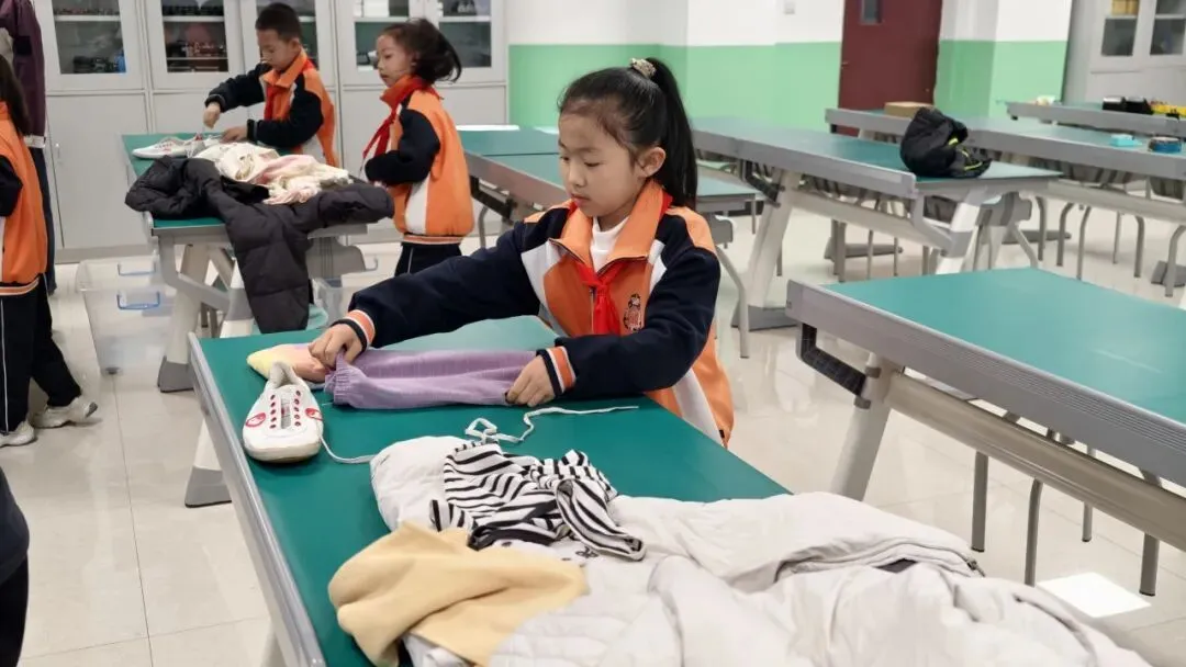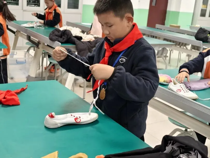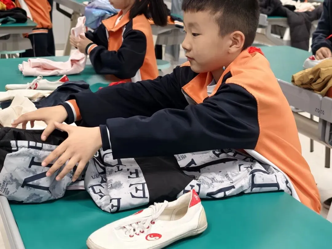 低年级组学生人小本领大。系红领巾环节,孩子们神情专注,左尖压右尖、绕圈、抽尖,鲜艳的红领巾在胸前整齐飘扬;整理衣物时,他们熟练地将衣服铺平、折叠、压实,动作一气呵成;系鞋带更是考验耐心与灵活度,只见鞋带在小手中穿梭、打结,一只只漂亮的蝴蝶结跃然“鞋”上。整个比赛井然有序,忙而不乱。