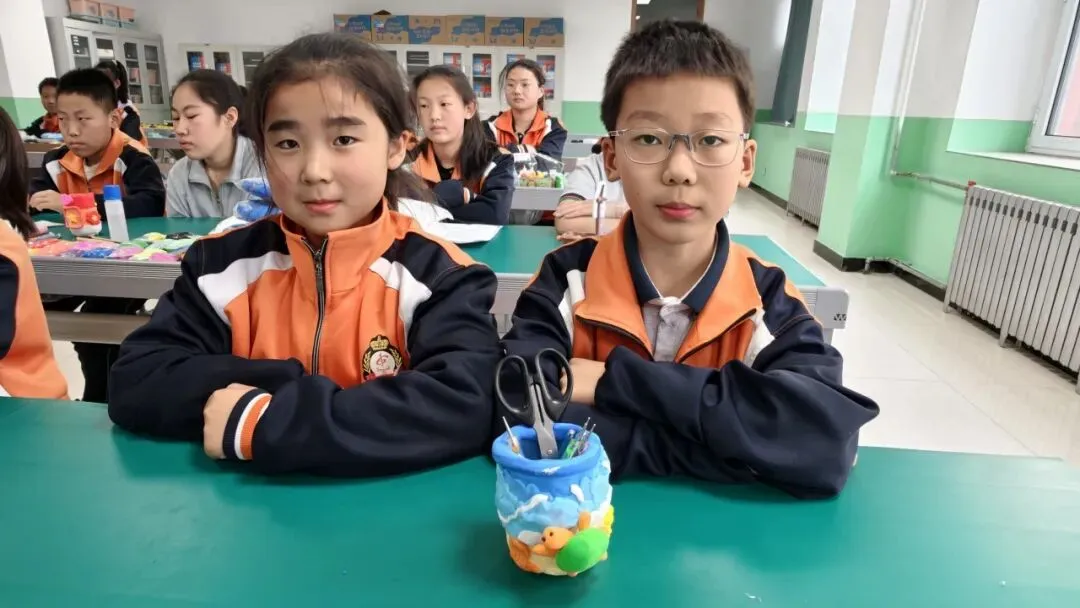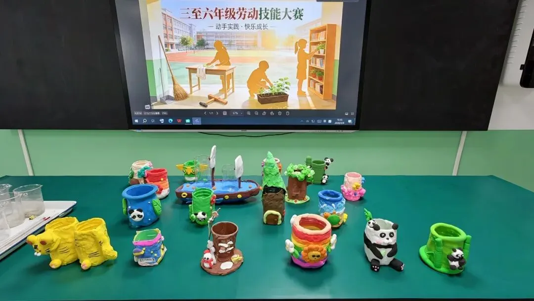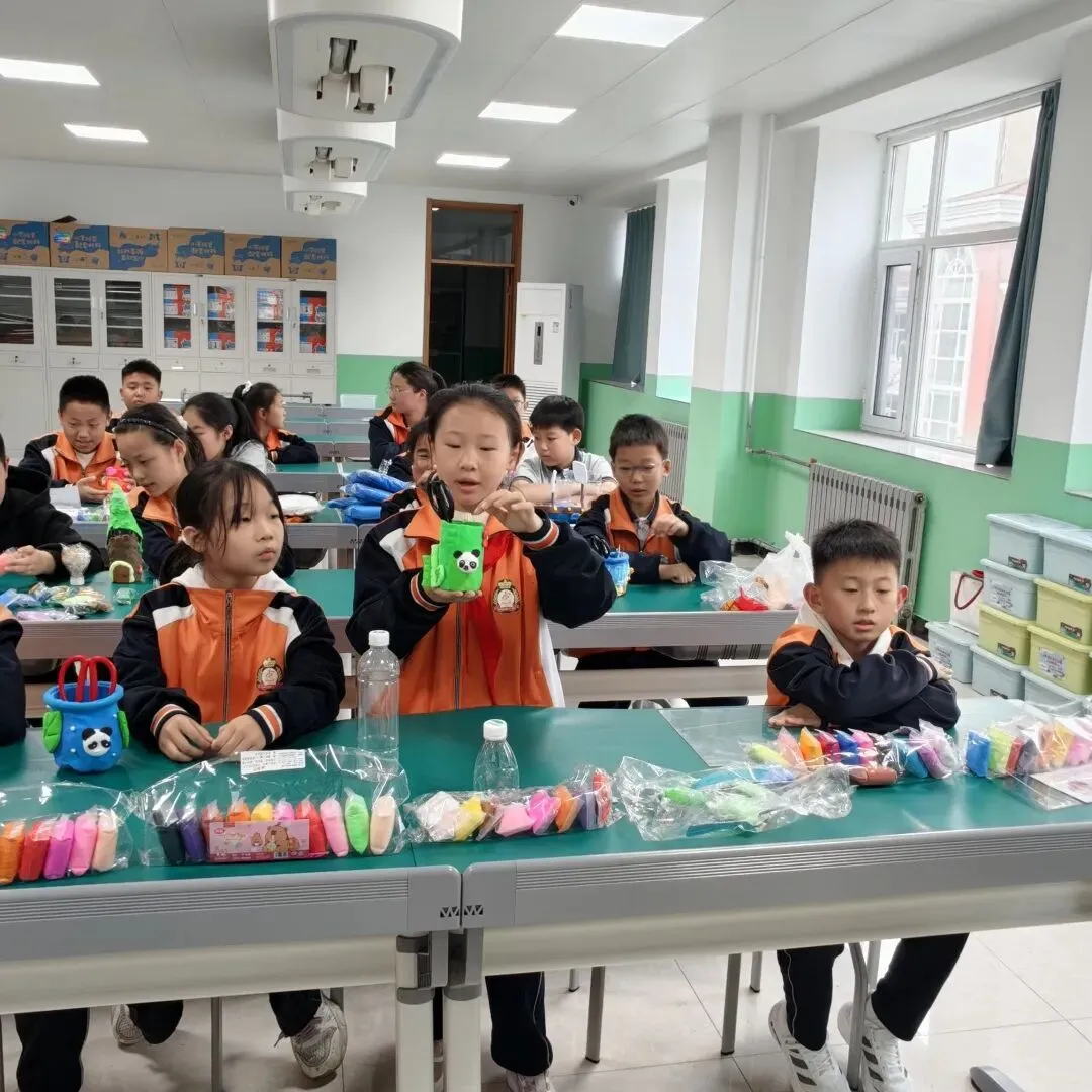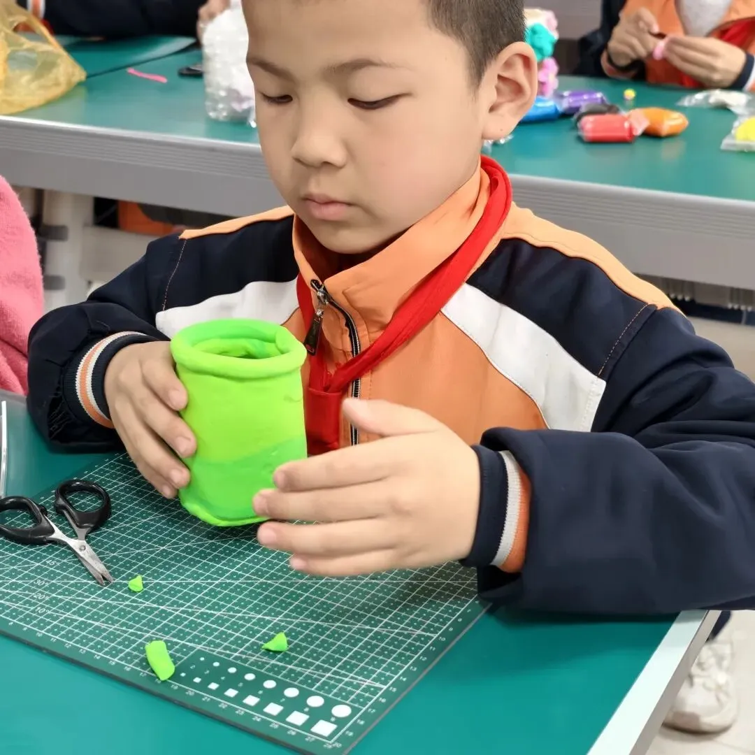高年级组比赛现场精彩纷呈。同学们以小组为单位,利用各色彩泥,通过揉、捏、搓、压、刻等技法,将普通彩泥变成了一件件兼具实用与美感的笔筒作品。有的以海洋为主题,蓝色波浪环绕筒身,海星、贝壳点缀其间;有的打造出童话城堡造型,色彩斑斓、充满童趣;还有的将废旧瓶罐作为内芯,外层用彩泥精心装饰,变废为宝。创作时间结束后,一个个独一无二的彩泥笔筒整齐陈列,令人眼前一亮。