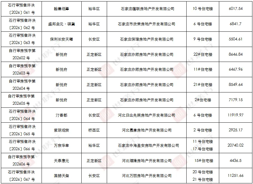 2026年3月,石家庄市行政审批局及各区域政府网站新增预售许可证公示24个,由长安区、桥西区、裕华区、新华区、藁城区、正定新区供应。