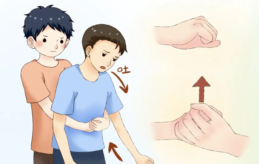 对于 1 岁以上的患者,可采用海姆立克急救法。施救者站在患者身后,双脚前后分开,前脚距离患者双脚约一脚宽,后脚脚跟踮起,膝盖微弯,使患者坐在自己弓起的大腿上。双臂环绕患者腹部,一手握拳,拇指顶住患者肚脐上方两横指处、剑突下方,另一手抓住握拳手,快速、有力地向内、向上冲击患者上腹部,每秒约 1 次,重复动作直至异物排出或患者恢复呼吸。对于 1 岁以下的婴儿,应将婴儿面朝下,放在手臂上,用手支撑婴儿的头部和颈部,用另一只手的掌根在婴儿背部两肩胛骨之间快速拍打 5 次。然后将婴儿翻转面朝上,在两乳头连线中点处,用两手指快速按压 5 次,如此反复进行,直至异物排出。