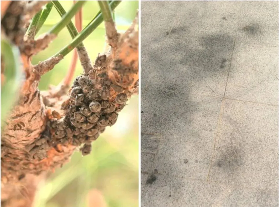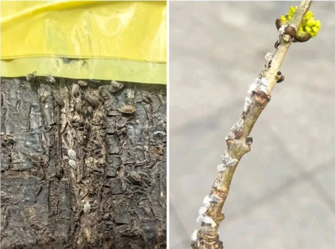 1、草履蚧。现主要以若虫聚集在寄主植物枝干、芽基等部位吸汁危害,排泄蜜露,并陆续蜕皮,严重影响树势和景观效果。寄主植物:悬铃木、白蜡、槐、紫叶李、海棠、樱花、月季等。