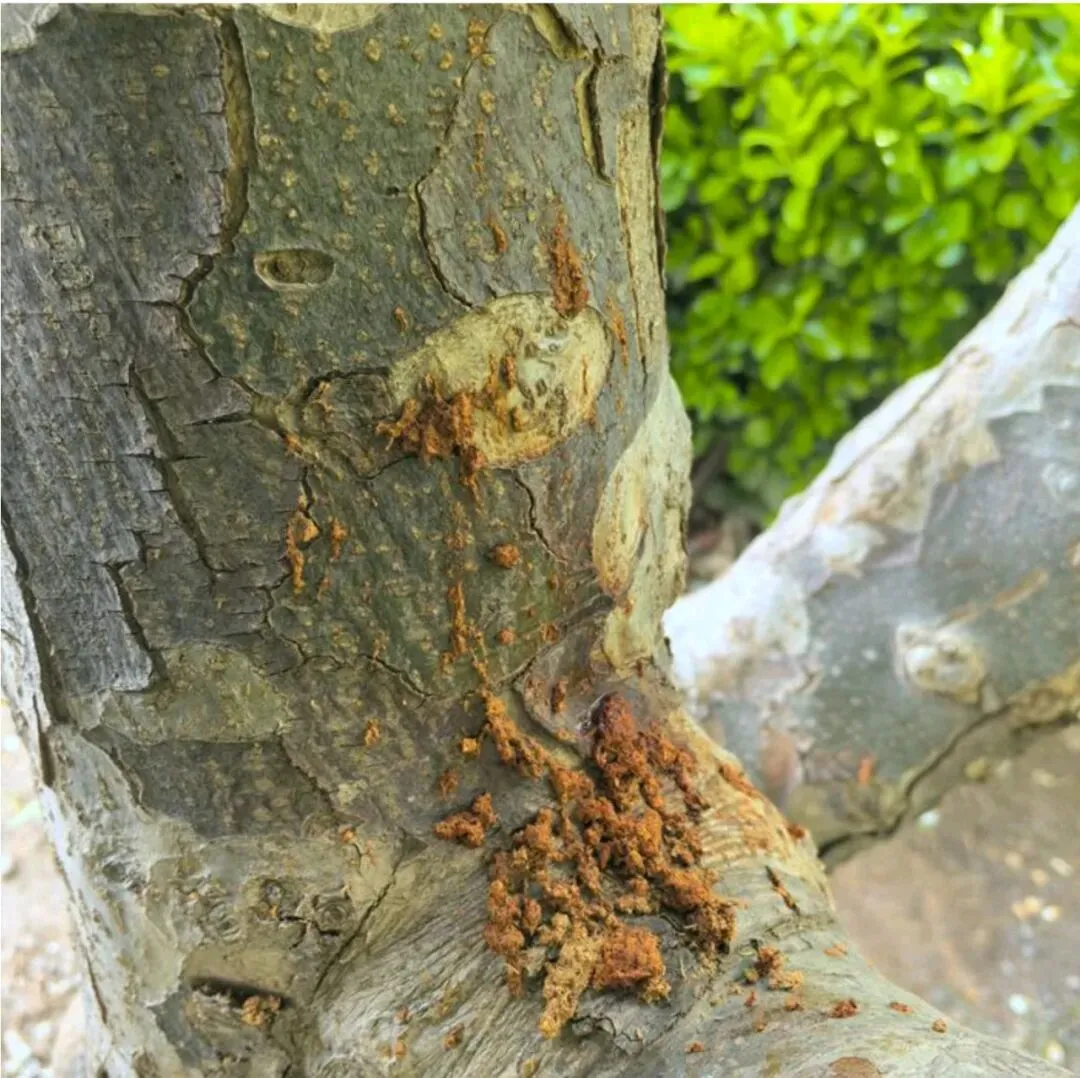 3、天牛。现阶段主要以幼虫在树干或枝条内蛀食危害,并从蛀孔处向外排出虫粪木屑,阻碍养分和水分的输送,导致树木生长衰弱。严重时,造成枝干干枯或风折。寄主植物:悬铃木、桃、柳、樱花、海棠、白蜡、紫叶李等。