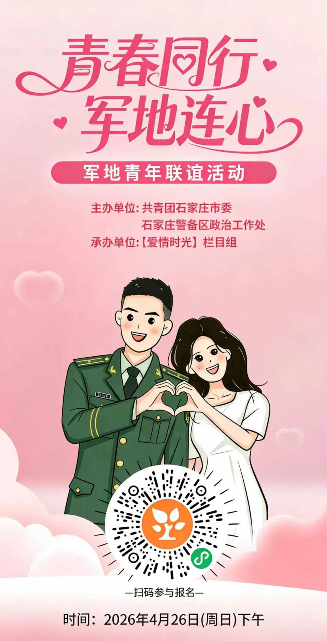 由共青团石家庄市委、石家庄警备区政治工作处联合【爱情时光】栏目组打造的 「青春同行・军地连心」军地青年联谊活动 ,4 月 26 日浪漫上线!