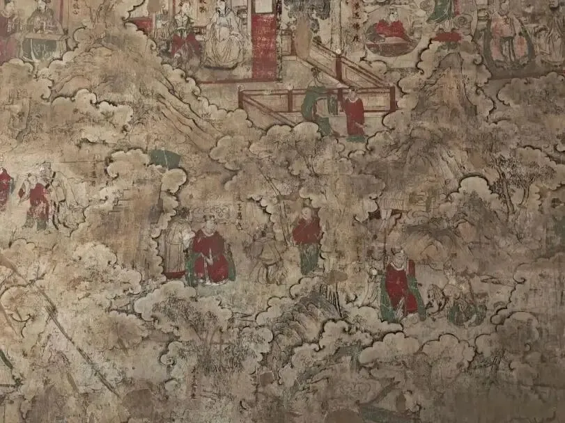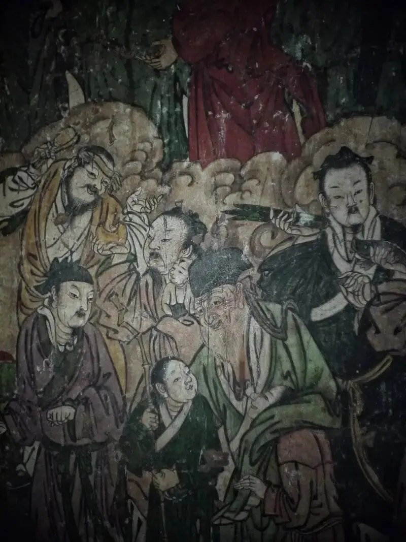 殿内四壁全是壁画,面积很大,上面画满了各种人物,有佛、菩萨、神仙,还有帝王、文臣武将、贤妇烈女,足足有五百多个人物,分成一百多组,每组旁边都有题字,能看清大概的人物身份。壁画用的是矿物质颜料,虽然过了几百年,颜色依然很鲜艳,以石绿、朱红为基调,搭配沥粉贴金,看着艳而不俗。