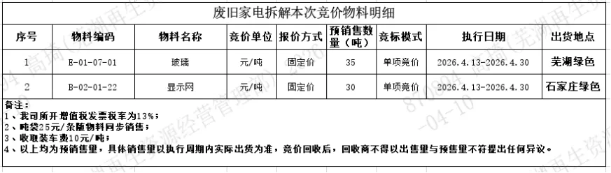 拟对以下物料价格进行竞价,下表中出售量仅供参考,最终数据以我司出售时过磅数量为准。竞价回收后,回收商不得以出售量与预估量不符提出任何异议。