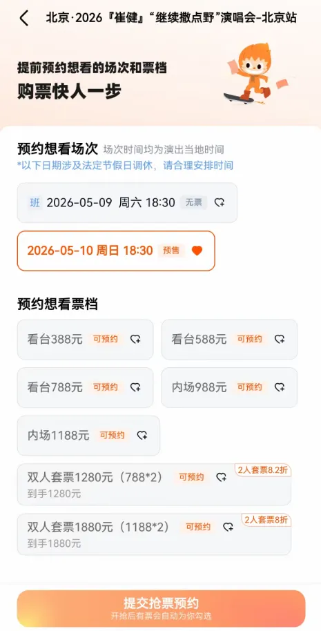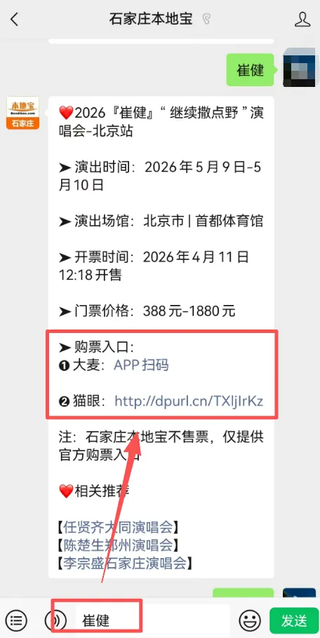 大麦、猫眼。也可关注【石家庄本地宝】公众号,私信回复【崔健】,即可获取购票入口。(注:石家庄本地宝不售票,仅提供官方购票入口,下同)