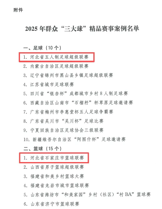【“河北五超”入选】国家体育总局近日公布2025年群众“三大球”精品赛事案例名单,河北省五人制足球超级联赛成功入选,跻身全国10个精品足球赛事之列。石家庄市篮球联赛也跻身篮球类精品赛事案例行列。