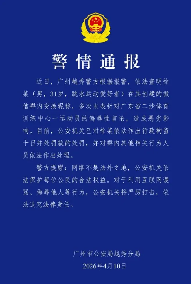 【警方抓获全红婵遭网暴案嫌疑人】广州警方4月10日通报全红婵遭网暴事件:查明徐某(男,31岁,跳水运动爱好者)在其创建的微信群内变换昵称,多次发表针对广东省二沙体育训练中心一运动员的侮辱性言论,公安机关已对其依法作出行政拘留十日并处罚款的处罚,并对群内其他相关行为人员依法作出处理。