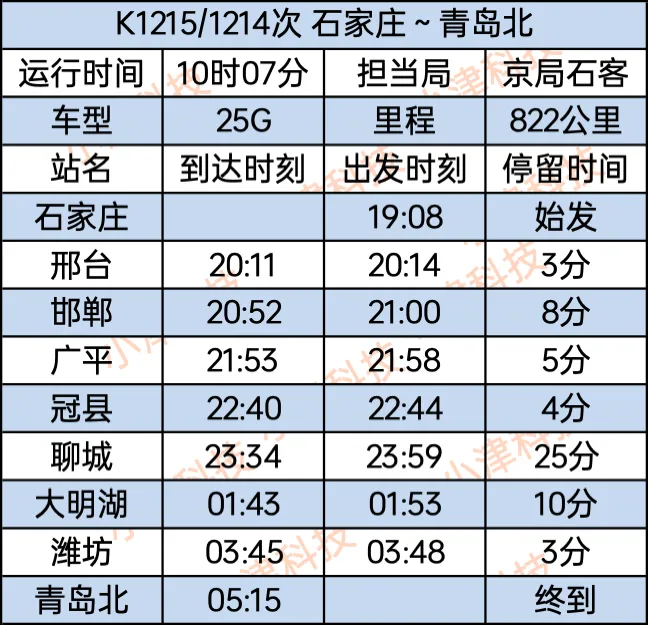 石家庄站至青岛北站K1215/1214次列车全程运行10小时07分钟,石家庄站19:08始发,经停邢台、邯郸、广平、冠县、聊城、大明湖(原济南东站)、潍坊,次日5:15终到青岛北站。