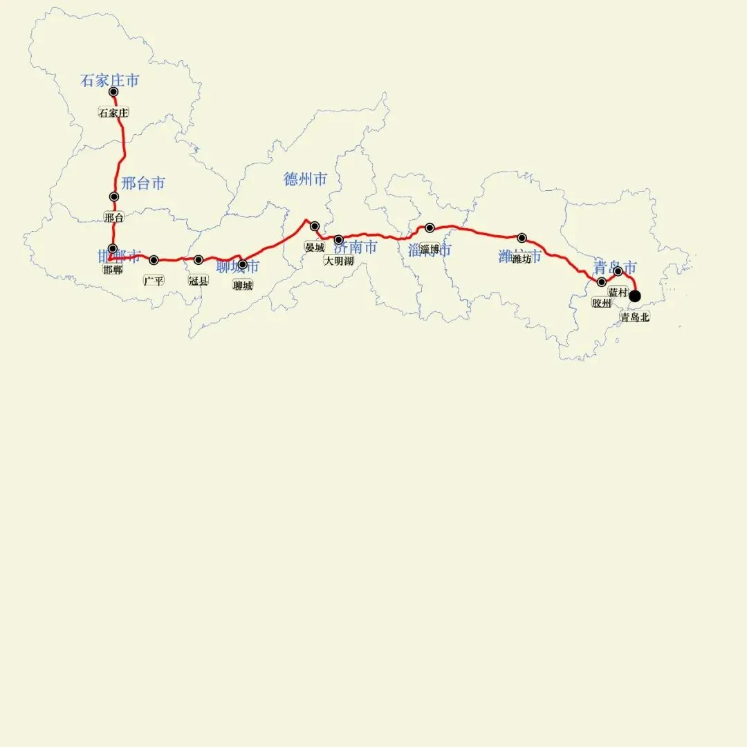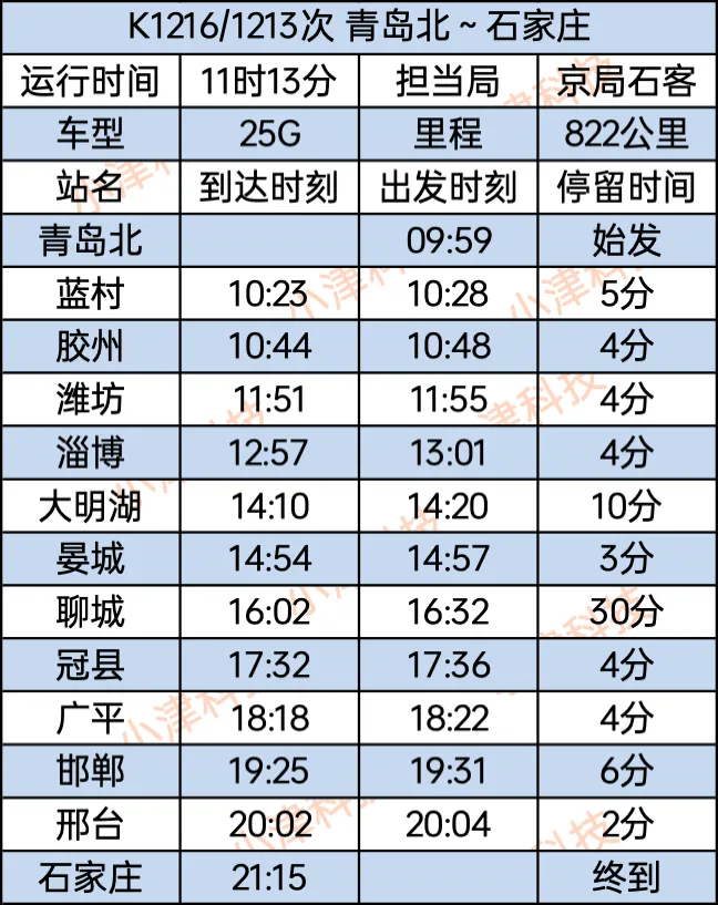 青岛北站至石家庄站K1216/1213次列车全程运行11小时13分钟,青岛北站9:59始发,经停蓝村、胶州、潍坊、淄博、大明湖、晏城、聊城、冠县、广平、邯郸、邢台,21:15终到石家庄站。