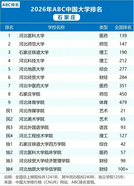 高校排名也是评价一个地区高等教育发展水平、学科特色、办学层次等的重要标准之一。2026年ABC中国大学排名(石家庄)的公布,给我们全面剖析石家庄市高校布局赋予了权威的数据支撑。ABC排名体系是由中国大学排行榜(CNUR)所研发的,包含人才培养、科研成果、师资力量、社会声誉、国际化水平等各方面指标,评价体系比较科学严谨,被高等教育界普遍认可。石家庄是河北省省会,也是京津冀协同发展的主要节点城市,高等教育虽然不如北京、天津,但是在区域内起着人才培养、科技创新和文化引领的重任。本次排名清楚地表现出石家庄高校“医科和师范领先,理工和财经紧跟,民办和独立学院有特色的”结构特点,体现出各个学校对于地方产业的服务能力、支撑省会发展所作出的积极努力以及在促进区域教育均衡过程中所起的实际作用。