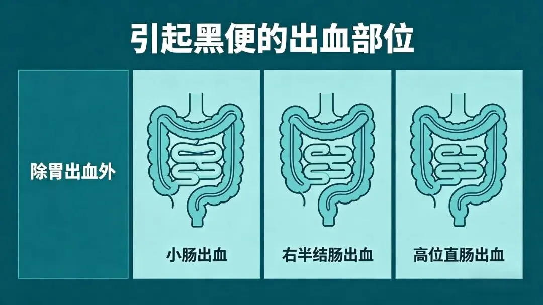 出血不只在胃里。小肠、右半结肠出血,血液在肠道待久了,一样拉黑便。