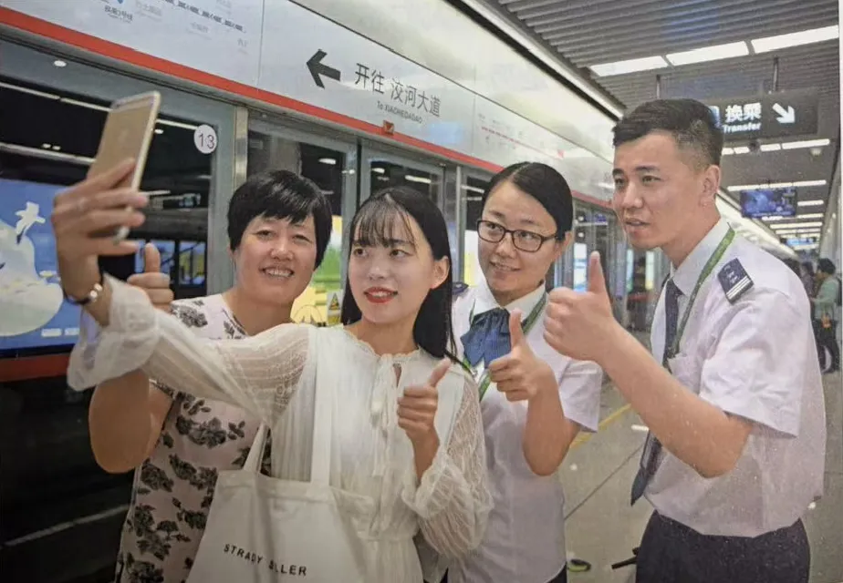 2017年6月14日,石家庄地铁试乘首日,市民与地铁工作人员合影