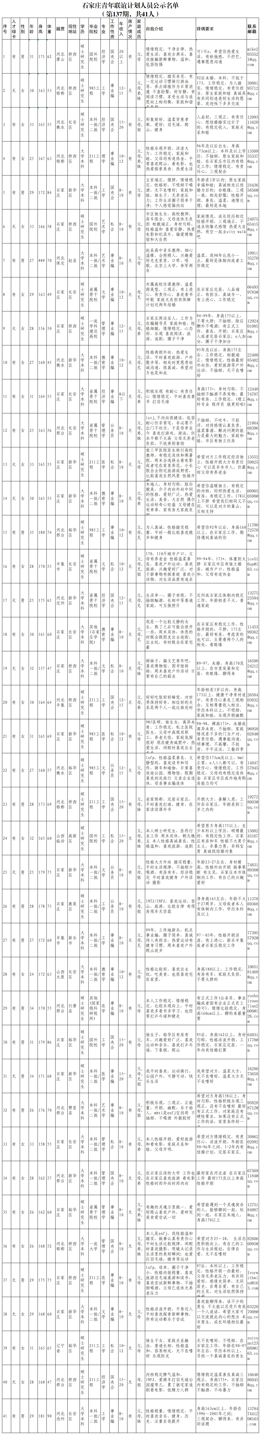 根据《石家庄青年人才公益联谊相亲计划》项目规划,经过本人申请、平台初审,现公示公开人员信息,符合择偶要求条件后请通过邮箱发邮件联系,以及参加后续交流活动。