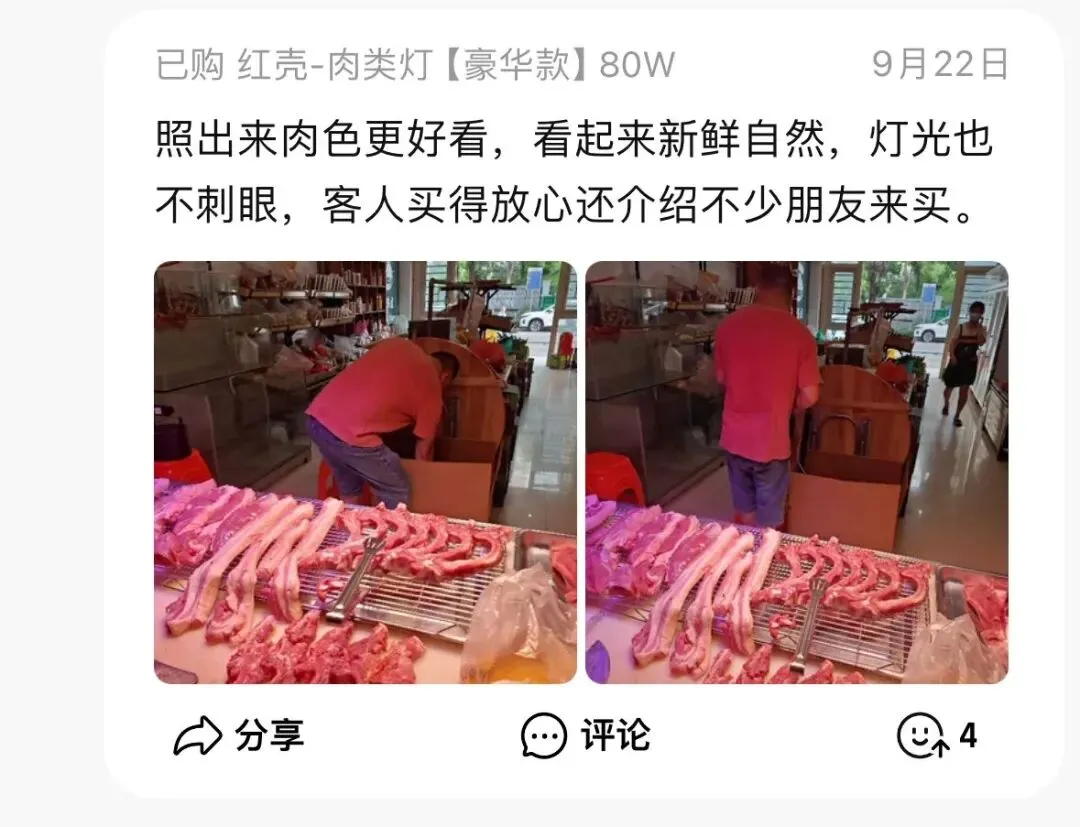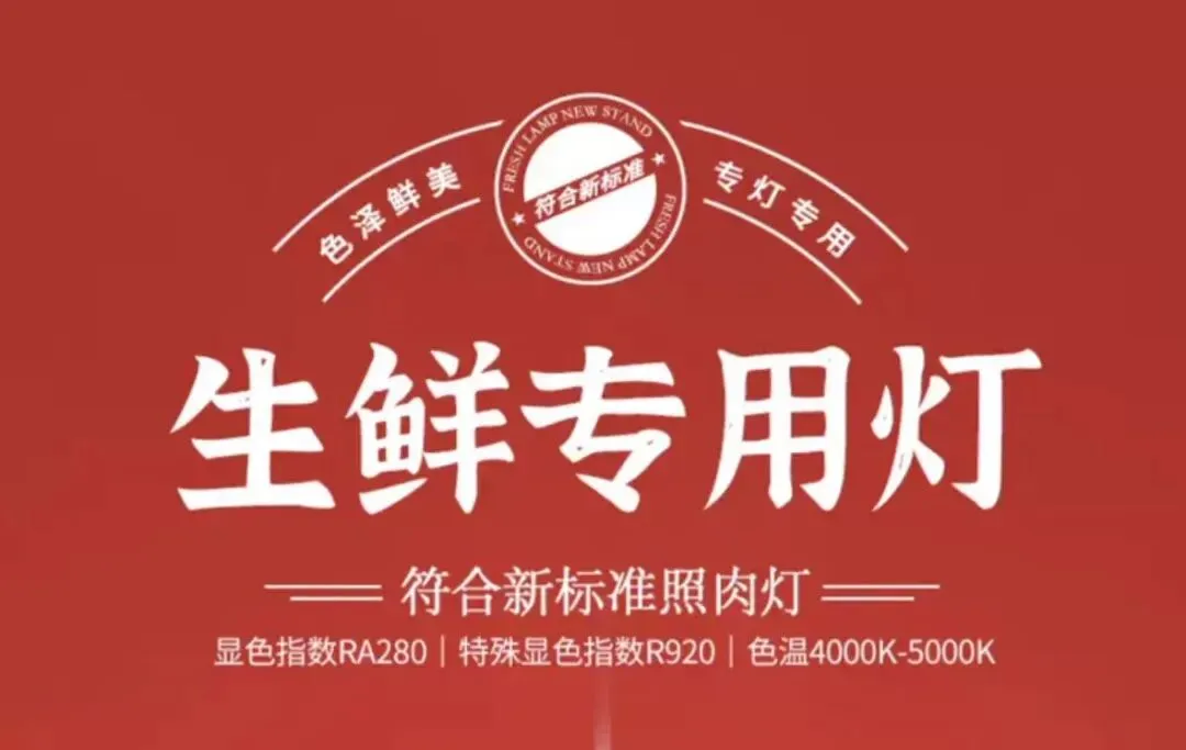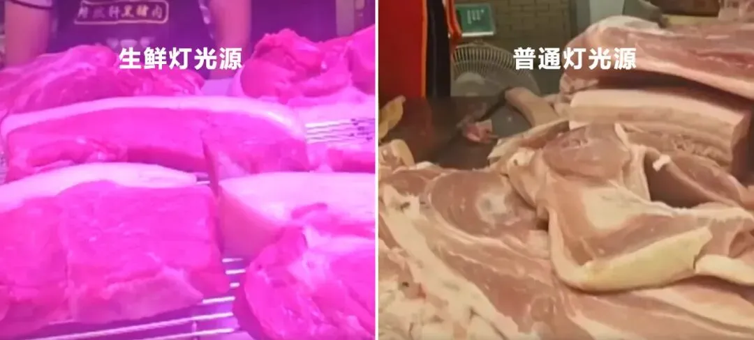 生鲜灯和我们日常使用的灯目的不同,平时的灯是想要尽量还原物体本身的颜色,呈现清晰的细节,而生鲜灯的目的是模糊细节,让肉更红、菜更绿。