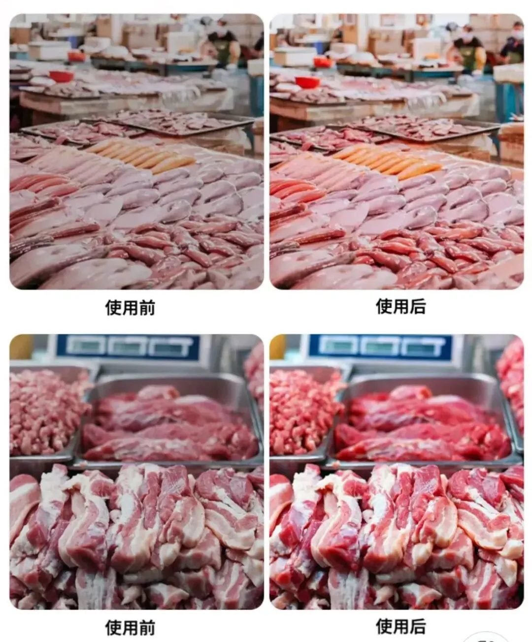 通过混合光源及调整显色指数等参数,生鲜灯直接给食物加了层美颜滤镜。