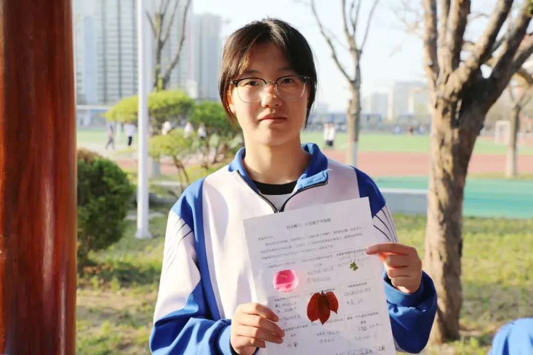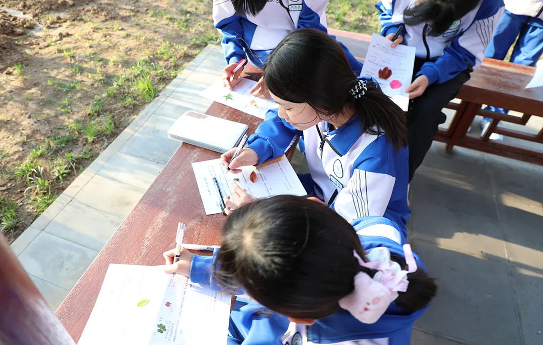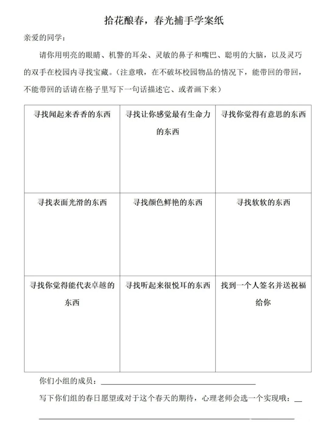 每个同学拿到一张《拾花酿春,春光捕手》学案纸,上面列了九项寻宝任务——用眼睛找颜色,用耳朵收声音,用鼻子闻气味,用手摸质感,用心感受生命的力量。