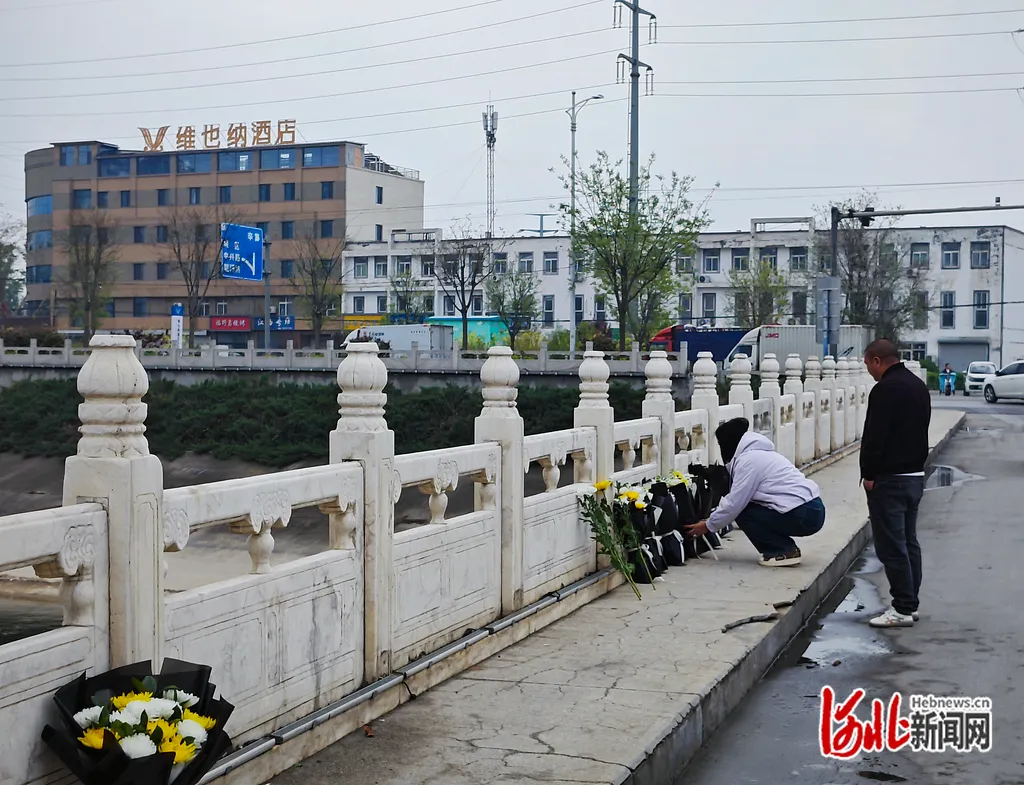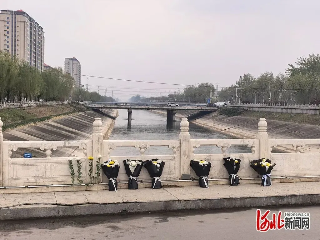 4月9日,天空阴沉,石家庄晋州市石津灌渠跨渠大桥上摆放着一束束菊花。微风拂过,花瓣轻颤,寄托着百姓对三位勇士的深切缅怀。4月8日,中共晋州市委政法委发布《见义勇为公示》,拟确认参与救人牺牲的徐闯、赵天源2人为见义勇为行为人,公示期为2026年4月9日至4月23日。辅警马秋诗因公殉职的相关手续也正在办理中。其中,徐闯、马秋诗两人为退役军人。