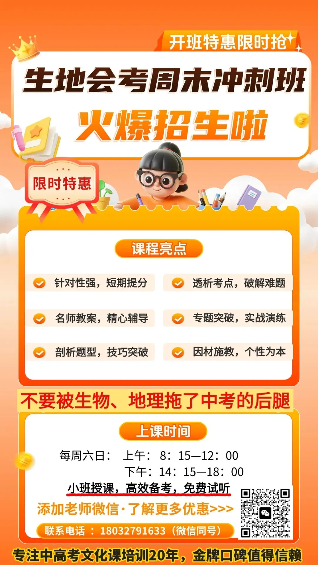 每周六、周日上午:8:15 — 12:00,下午:14:15 — 18:00,小班授课,高效备考,免费试听!孩子周末就能补,不占用平日上课时间,主课、生地两不耽误!✍️ 最后想对家长说