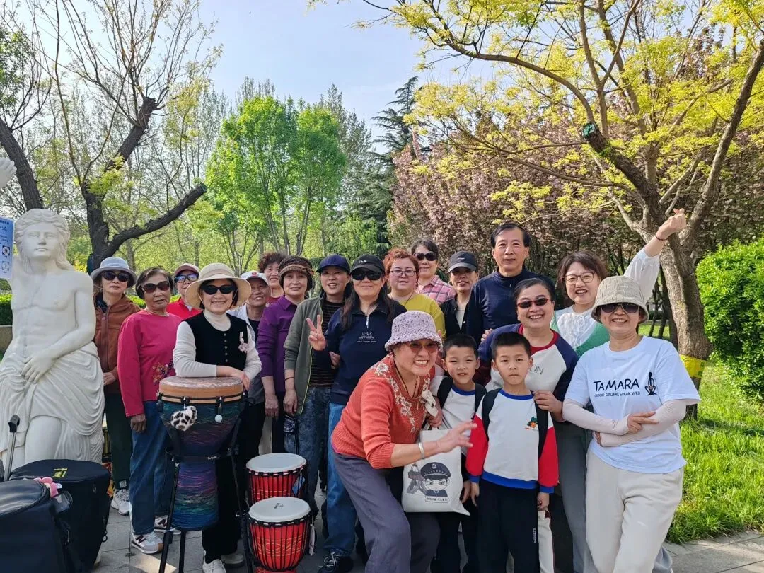 春日的欧韵公园,绿树成荫、春意正浓。塔玛拉的伙伴们刚开启鼓聚,便成为了公园里最亮眼的风景。