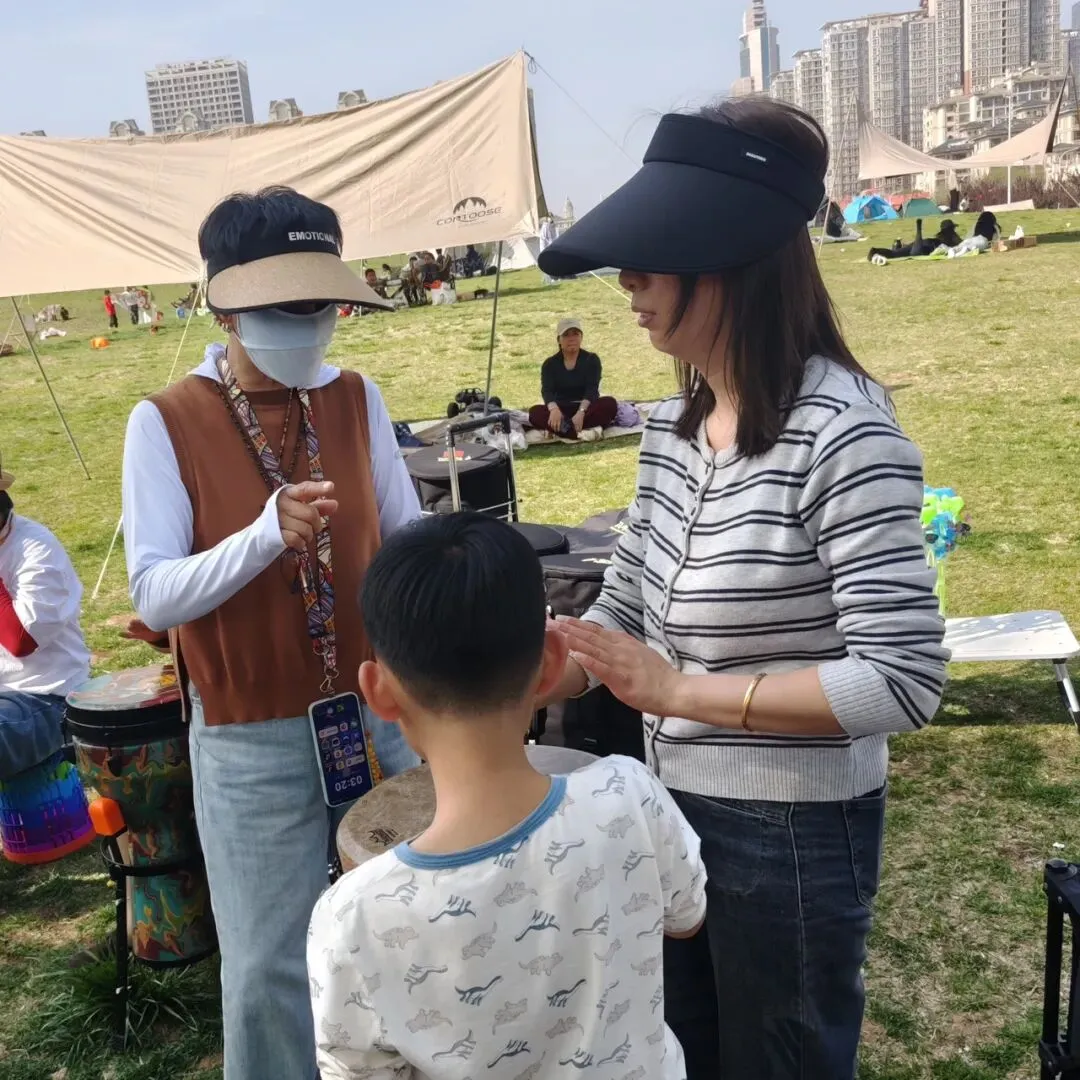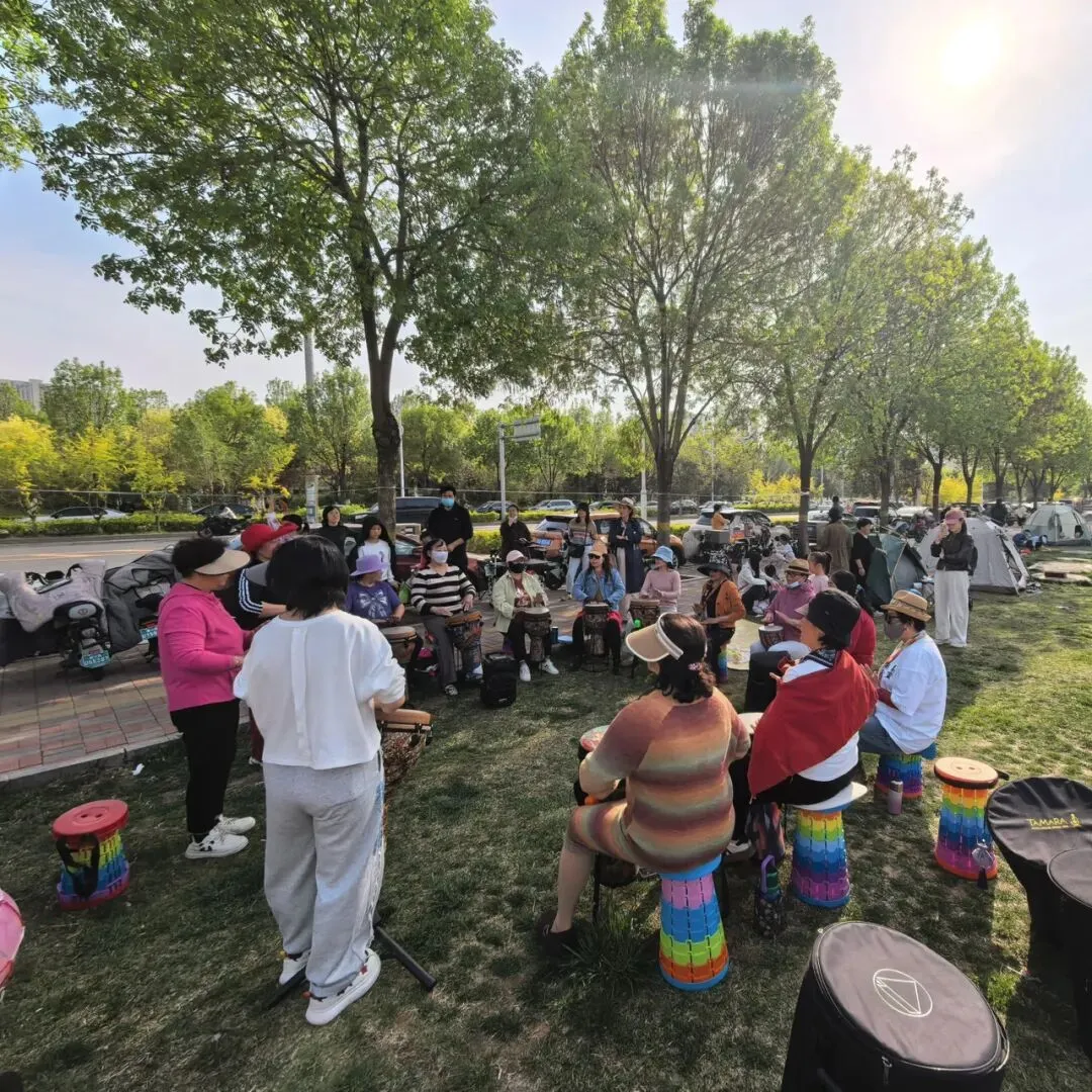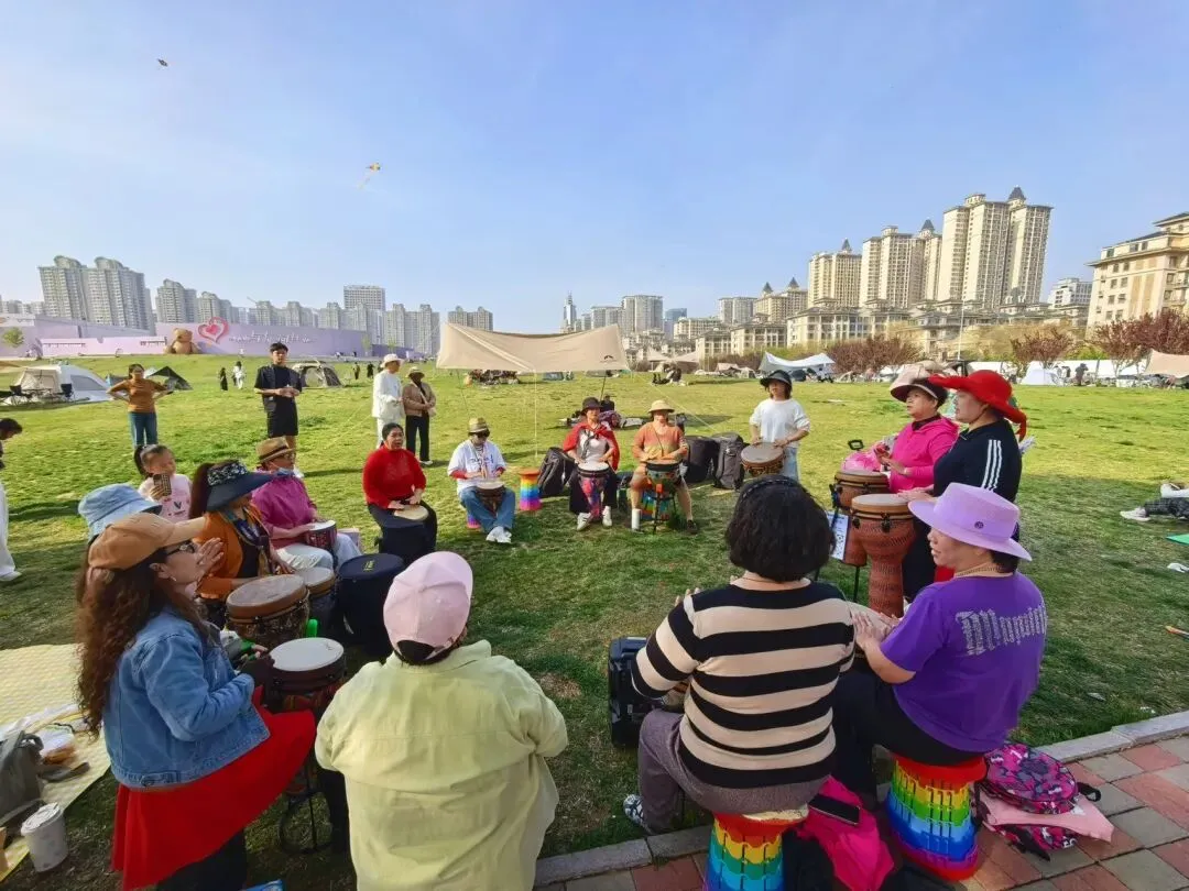 开阔的草坪上,伙伴们围坐成圈,非洲鼓整齐排列,随着节拍抬手、落掌,清脆有力的鼓声在草地上回荡,与远处的帐篷、春日的蓝天相映成趣。