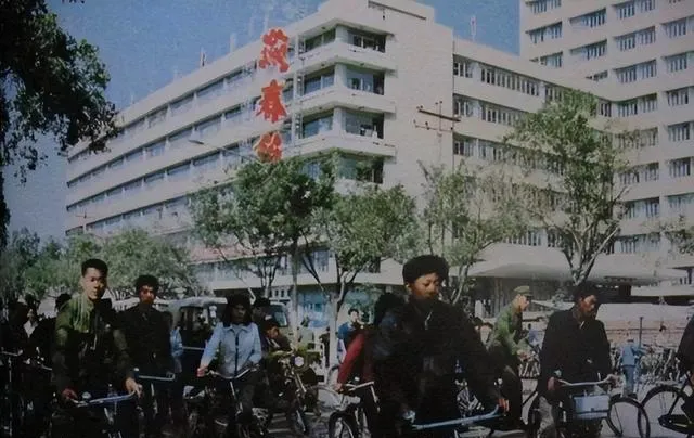 第一张最扎眼的,当然是**“燕春饭店”**那几个大字。楼体很规整,外立面不花哨,可在当年已经很有“城市门面”的感觉了。更有意思的是楼前这一排骑自行车的人,穿深色外套的、背包的、并排骑过去的,谁也不抢道,街面上有一种慢慢流动的秩序感。现在再看,会发现那时候的路边树也不少,楼下骑车、行人、零星机动车混在一起,居然不显乱。
