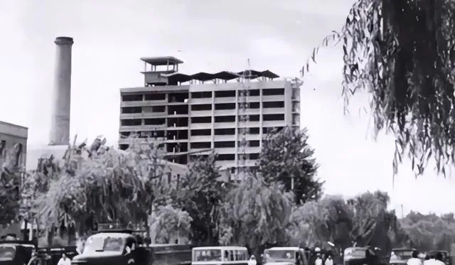 同样是燕春饭店,换到建设中的样子,感觉一下子又不一样了。钢筋水泥刚起骨架,旁边立着高烟囱,前面的汽车样子也很老派。说实话,这一张特别能看出那个年代城市发展的节奏:不是一夜之间冒出来的,而是一层一层往上长。很多老石家庄人对这类画面应该不陌生,路过工地,抬头看看,心里会想:这楼以后建好了,肯定气派。